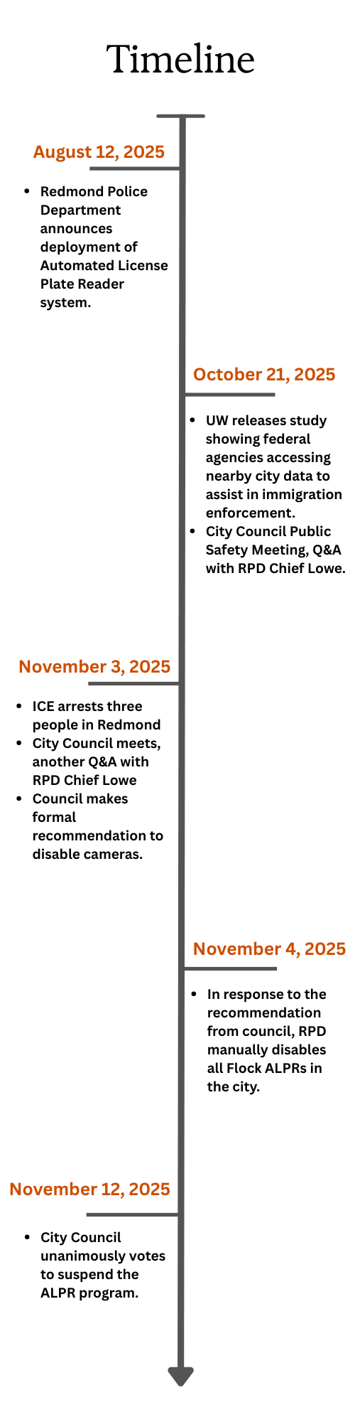 A timeline of events regarding Flock Cameras in Redmond, WA.